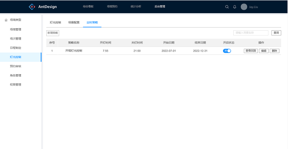 c)定时策略控制:可根据日期时间、节假日设定不同回路开关时间,自动执行。